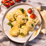 Die Ravioli in der gebräunten Butter schwenken, mit Rucola und geriebenem Parmesan servieren.