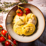 In der Zwischenzeit die Ravioli nach Packungsanweisung kochen und anschließend mit den Schmortomaten gemeinsam servieren und mit dem geriebenen Parmesan garnieren.