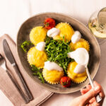 MONIS Ravioli nach Packungsanleitung kochen und auf dem gewaschenen Rucola servieren und mit dem Parmesanschaum garnieren.